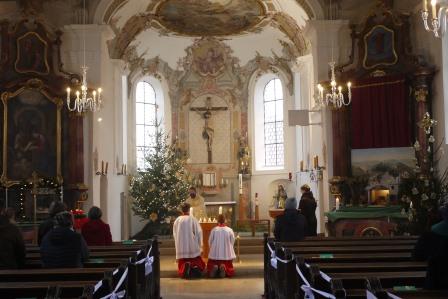 Wegen der Pandemie gab es wenige Weihnachtsgottesdienste in der Pfarreiengemeinschaft Ichenhausen. Am 1. Weihnachtsfeiertag zelebrierte Pater Joachim den Gottesdienst in der Kirche „St. Blasius“ in Oxenbronn. Lediglich 16 Plätze waren den Feiernden vorbehalten. Aber mit dem angewandten Hygienekonzept konnten sich die Gläubigen sicher fühlen und sich darüber freuen, gemeinsam zu feiern.